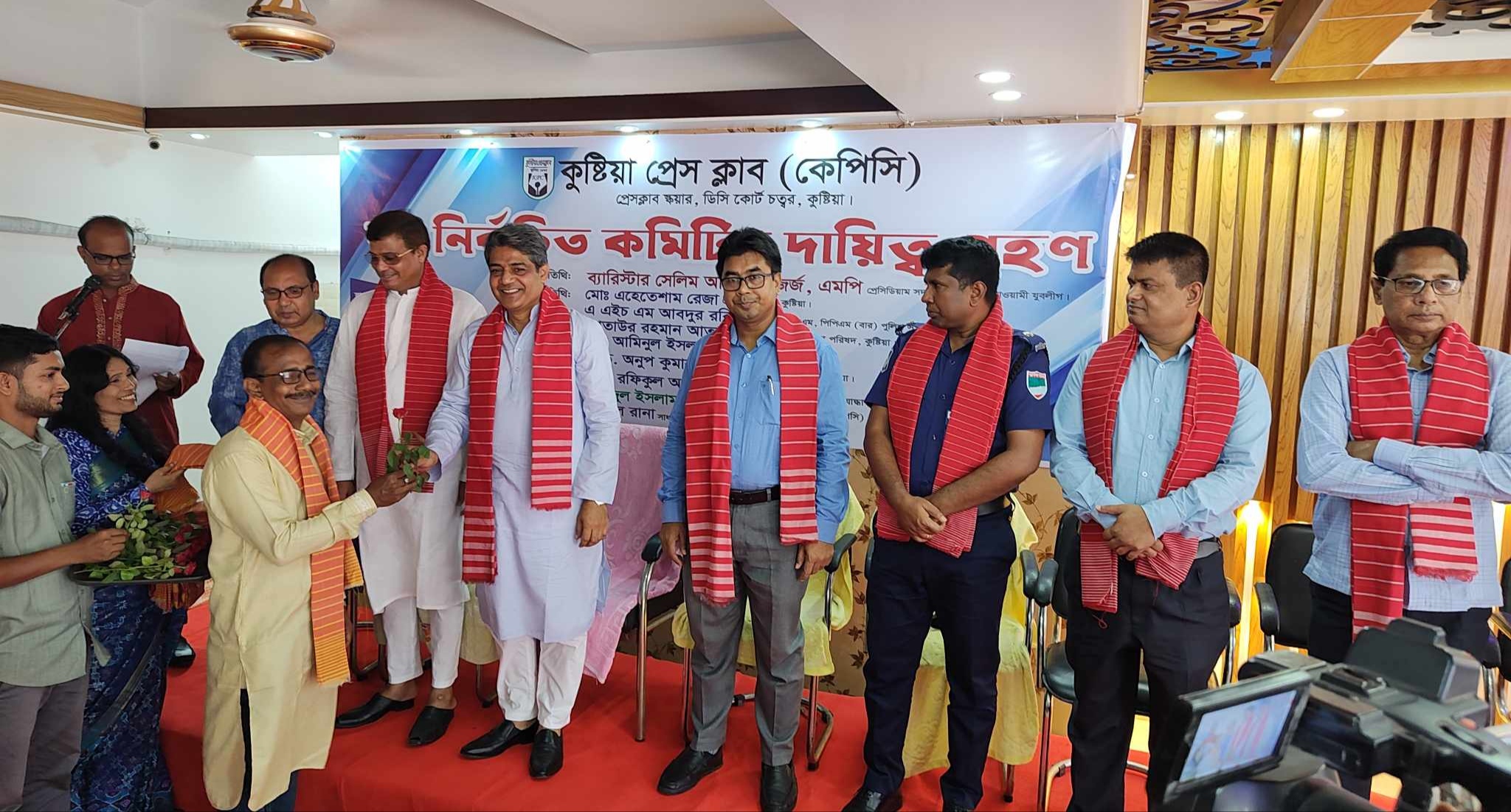 রেদওয়ানুল হক সবুজ : কুষ্টিয়া প্রেসক্লাব কেপিসির দ্বিবার্ষিক নির্বাচনে বিজয়ীরা দায়িত্ব গ্রহণ করেছেন। ৩০ তারিখ শনিবার দুপুর বারোটায় কুষ্টিয়া শেখ কামাল স্টেডিয়ামের সুইম ক্যাফে রেস্টুরেন্টে দায়িত্ব গ্রহণ অনুষ্ঠানে প্রধান অতিথি ছিলেন বাংলাদেশ আওয়ামী যুবলীগের প্রেসিডিয়াম সদস্য ব্যারিস্টার সেলিম আলতাফ জর্জ এমপি। তিনি সাংবাদিকদের দেশের পক্ষে মুক্তিযুদ্ধের চেতনার পক্ষে কাজ করার আহ্বান জানান। তিনি আরও বলেন, সংবাদপত্র সমাজের দর্পণ আর সাংবাদিকরা জাতির বিবেক। সাংবাদিকদের কাছে জনগনের প্রত্যাশা একটিই, সেটি হলো বস্তুনিষ্ঠ ও সঠিক সংবাদ। আশা করি গণমাধ্যমকর্মীরা এ বিষয়ে যত্নবান হবেন।