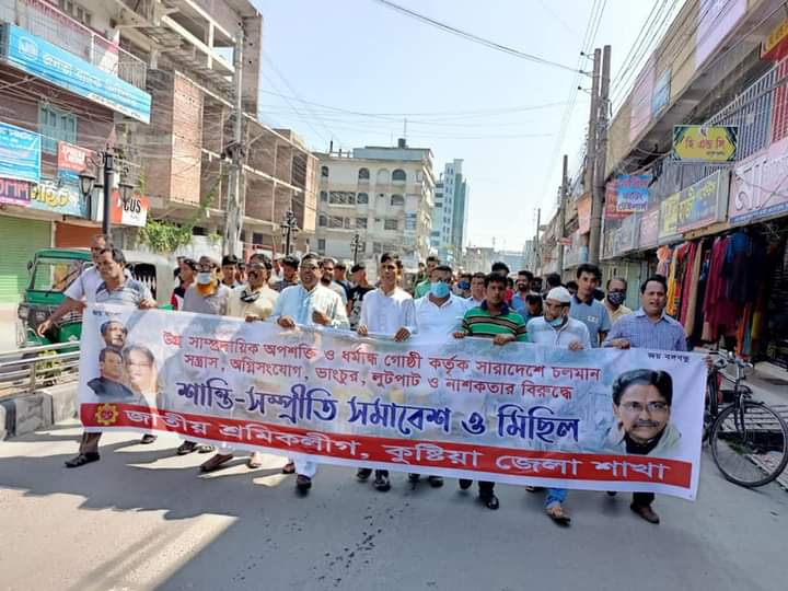 সাম্প্রদায়িক সন্ত্রাসের বিরুদ্ধে কুষ্টিয়ায় সম্প্রীতি সমাবেশ ও শান্তি শোভাযাত্রা করেছে জাতীয় শ্রমিকলীগ কুষ্টিয়া জেলা শাখা। এই কর্মসূচি থেকে সকল অপশক্তিকে প্রতিরোধের ঘোষণা দেয়া হয়েছে। হামলায় জড়িতদের দ্রুত বিচারের আওতায় আনার কথাও বলা হয় সমাবেশ থেকে।