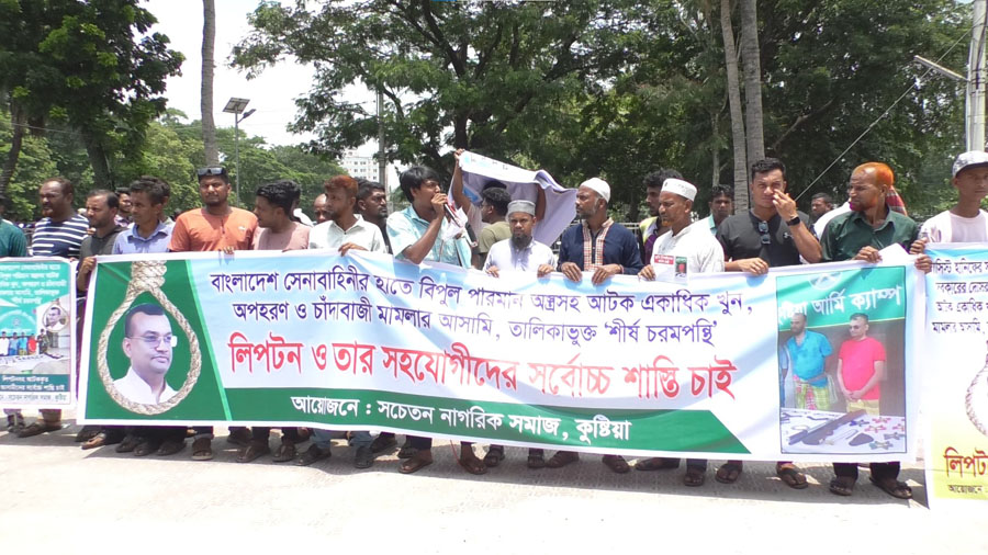 দক্ষিন-পশ্চিমালের কুষ্টিয়ার শীর্ষ চরমপন্থী একাধিক হত্যা, গুম, অপহরণ ও চাঁদাবাজীসহ নানা অপরাধের মামলার আসামি জাহাঙ্গীর কবির লিপটন কে বিপুল পরিমান আগ্নেয়াস্ত্র ও গোলাবারুদসহ তার তিন সহযোগিকে আটক করে কুষ্টিয়া সেনাবাহিনী। পরবর্তীতে ইবি থানার অফিসার ইনচার্জ লিপটনকে ৪ নং আসামী বানিয়ে জেল হাজতে প্রেরন করেন। যে কারনে ভ’ক্তভোগী বাসিন্দাদের মনে ক্ষোভ জন্ম নেয়। যার ফল শ্রুতিতে ১৫ তারিখ রবিবার দুপরে কুষ্টিয়া সচেতন নাগরিক সমাজের ব্যানোরে লিপ্টনের ফঁসির দাবিতে কুষ্টিয়া ডিসি অফিসের সামনে প্রায় ৫ শতাধিক নারী পুরুষ মানববন্ধন ও বিক্ষোভ সমাবেশ করেন। মানববন্ধন শেষে জেলা প্রশাসকের কাছে স্মারকলিপি প্রদান করেন।