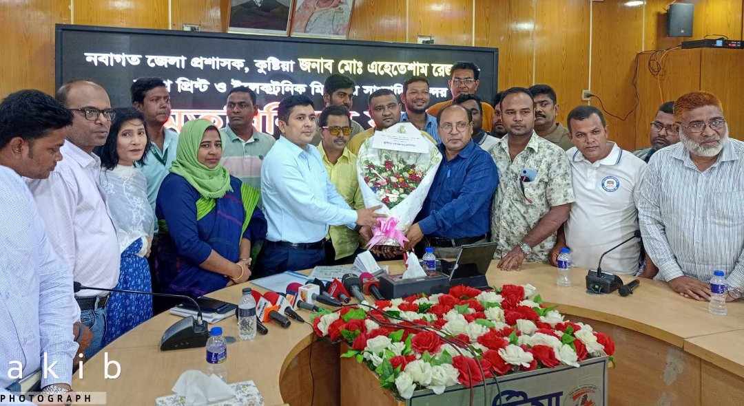 কুষ্টিয়া প্রেসক্লাব কেপিসি'র সাংবাদিকদের সাথে আজ বেলা ১১ টায় জেলা প্রশাসকের সম্মেলন কক্ষে নবাগত জেলা প্রশাসক ও কুষ্টিয়া প্রেসক্লাব কেপিসি'র প্রধান পৃষ্ঠপোষক এহেতেশাম রেজা মতবিনিময় করেন। এসময় উপস্থিত ছিলেন অতিরিক্ত জেলা প্রশাসক সার্বিক শারমিন আখতার, অতিরিক্ত জেলা ম্যাজিষ্ট্রেট, এনডিসি শাহেদ আরমান, নির্বাহী ম্যাজিষ্ট্রেট স্বরুপ মুহুরী।