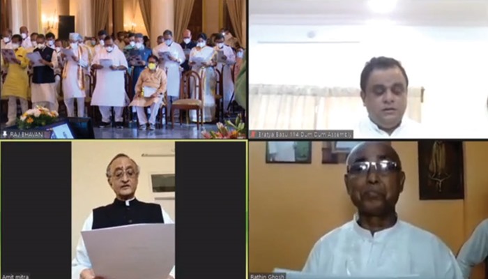 পশ্চিমবঙ্গ রাজ্য সরকারের নতুন মন্ত্রিসভার শপথগ্রহণ সম্পন্ন হয়েছে। করোনার বিধিনিষেধের কারণে এবার রাজভবনে ছোট আকারে মাত্র ছয় মিনিটের মধ্যে শপথগ্রহণ অনুষ্ঠান শেষ হয়।