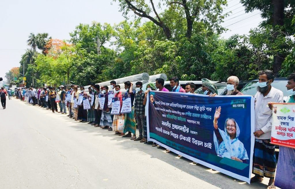 রাকিব : বিদেশী বহুজাতিক কোম্পানির আগ্রাসন থেকে দেশীয় তামাক কোম্পানীগুলো বাচিঁয়ে রাখতে সংরক্ষিত ৪০ শতাংশ মনোপলি আইন কার্যক্ররসহ ২০ দফা দাবীতে কুষ্টিয়ায় তামাক চাষীরা মানববন্ধন করেছে। ২৬ এপ্রিল মঙ্গলবার বেলা ১১টায় ডিসি কোর্টের সামনে কুষ্টিয়া-ঝিনাইদহ মহাসড়কে অনুষ্ঠিত মানববন্ধনে কয়েক শ’ অবহেলিত তামাক চাষী অংশ নেন। এতে বক্তব্য রাখেন, কুষ্টিয়া জেলা তামাক কল্যাণ সমিতির সভাপতি আশরাফুল ইসলাম, তামাক চাষীদের নেতা একরামুল হক।