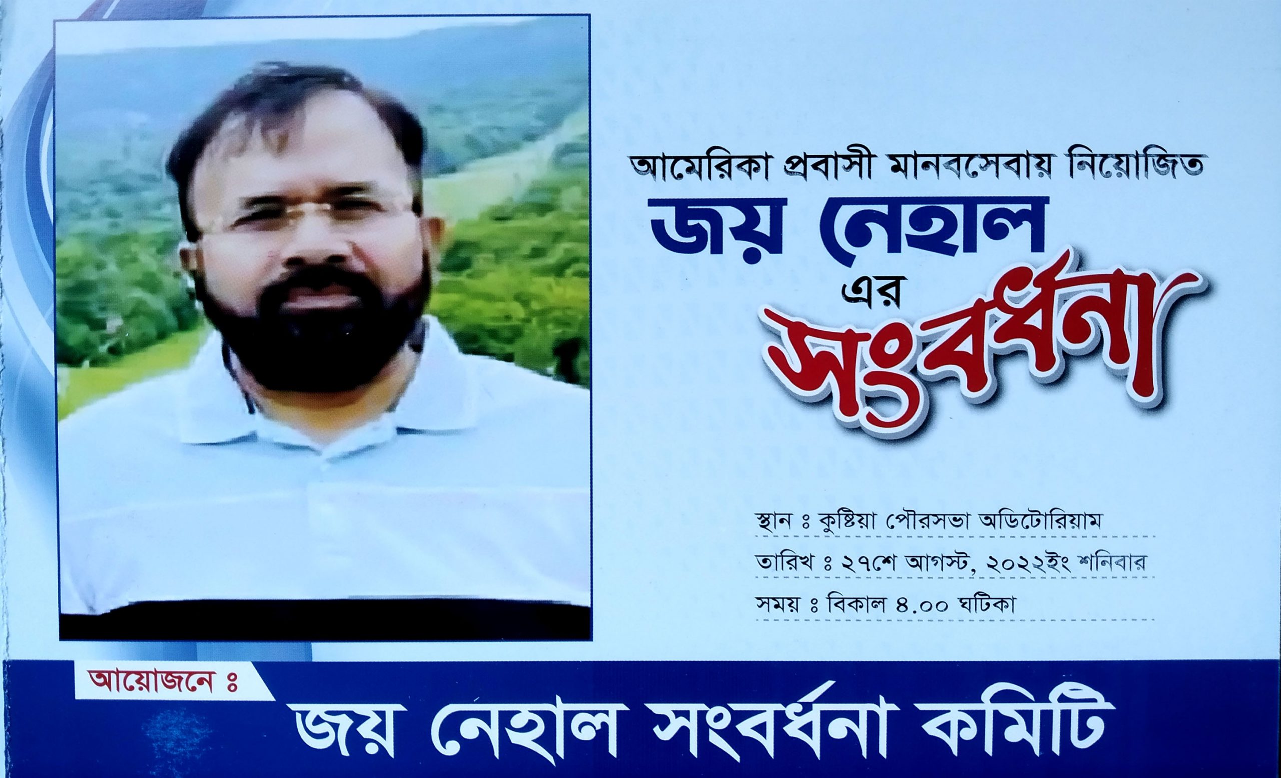 বিশিষ্ট রাজনীতিবিদ, ক্রীড়া ও সংস্কৃতিক ব্যক্তি ও জয় নেহাল সংবর্ধনা কমিটির আহ্বায়ক মতিউর রহমান লাল্টু ও সদস্য সচিব ড. আমানুর আমানের আমন্ত্রনে। ২৭ তারিখ শনিবার বিকাল ৪ ঘটিকার সময় কুষ্টিয়া পৌর অডিটোরিয়ামে তাকে সম্মাননা প্রদান করবেন। উক্ত সংবর্ধনা অনুষ্ঠানে প্রধান অতিথি হিসেবে উপস্থিত থাকবেন, বিশিষ্ট রাজনীতিবিদ ও কুষ্টিয়া জেলা আওয়ামী লীগের সাধারণ সম্পাদক বীর মুক্তিযোদ্ধা মো: আজগর আলী, প্রধান বক্তা হিসাবে উপস্থিত থাকবেন ইসলামী বিশ্ববিদ্যালয়ের প্রোভিসি প্রফেসর ড. মোঃ মাহবুবুর রহমান, বিশেষ অতিথি হিসেবে উপস্থিত থাকবেন ইসলামী বিশ্ববিদ্যালয়ের ট্রেজারার প্রফেসর ড. মোঃ আলমগীর হোসেন ভূঁইয়া।