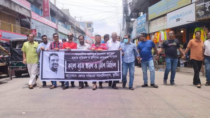 প্রতিবাদী কন্ঠ ডেস্ক : সাংবাদিক হাসিবুর রহমান রুবেল হত্যার প্রতিবাদে ১৭তম দিনে কুষ্টিয়ার আটটি সাংবাদিক সংগঠনের উদ্যোগে শহরে এক বিশাল মৌন মিছিল অনুষ্ঠিত হয়েছে। এ উপলক্ষে আজ বুধবার দুপুর ১২টায় কুষ্টিয়া প্রেসক্লাব চত্বরে কুষ্টিয়া প্রেসক্লাব, কুষ্টিয়া প্রেসক্লাব (কেপিসি) সাংবাদিক অধিকার ফোরাম, সাংবাদিক ইউনিয়ন কুষ্টিয়া, কুষ্টিয়া সাংবাদিক ইউনিয়ন ও অনলাইন প্রেসক্লাবসহ আটটি সাংবাদিক সংগঠন পৃথক পৃথক ব্যানারে ও সর্বস্তরের সাংবাদিকদের ব্যানারে একাত্মতা ঘোষণা করে মুখে কালো কাপড় বেঁধে মৌন মিছিল করেছে।
