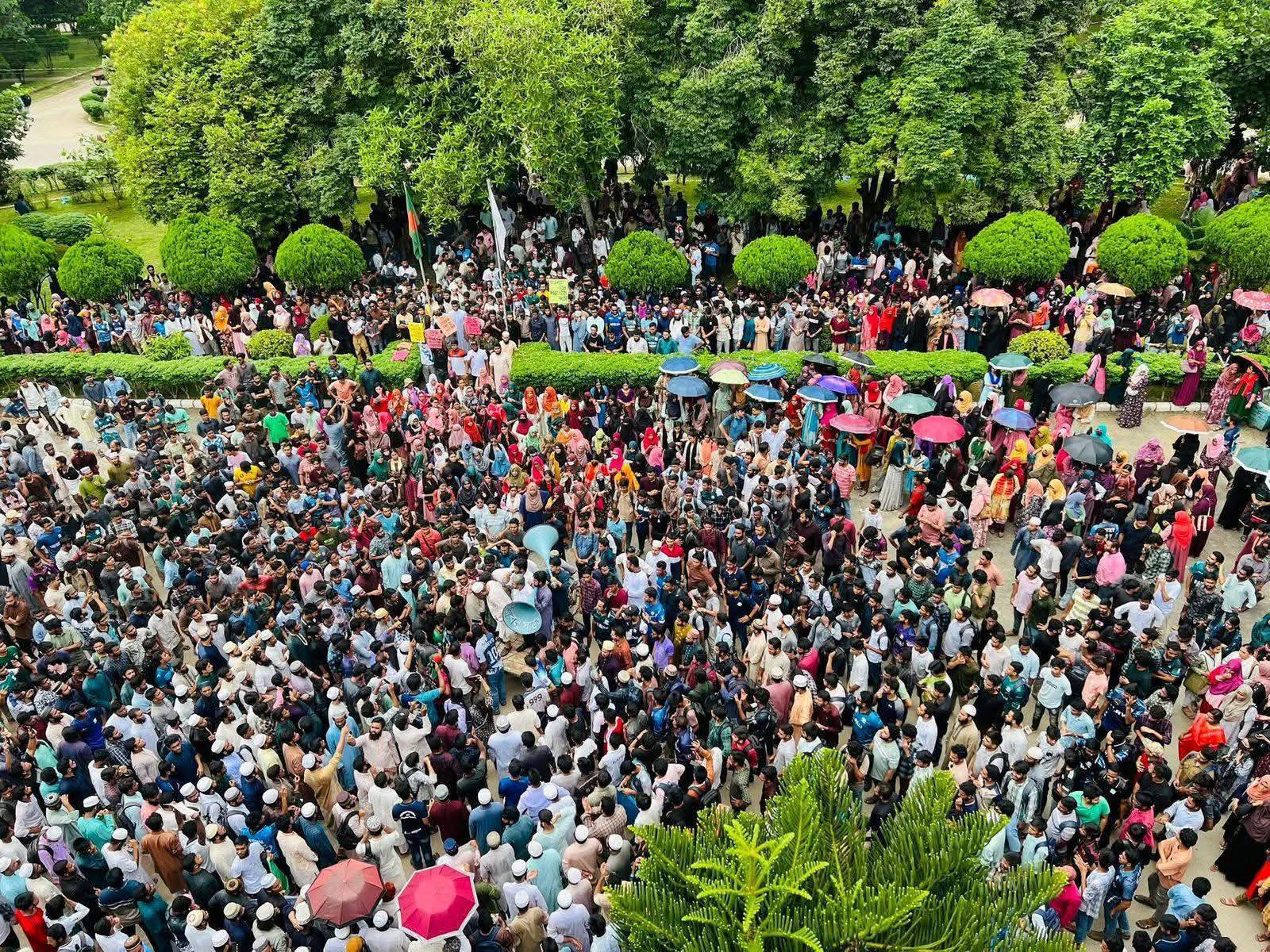 এদিকে বেলা সাড়ে ১১টায় প্রশাসন ভবন থেকে শিক্ষার্থীদের একাংশ বিশ্ববিদ্যালয়ের কেন্দ্রীয় ফুটবল মাঠে যান। সেখানে সাজিদ আবদুল্লাহর গায়েবানা জানাজা অনুষ্ঠিত হয়। উপ-উপাচার্য, কোষাধ্যক্ষ, রেজিস্ট্রারসহ শিক্ষক-কর্মকর্তারা জানাজায় অংশ নিতে চাইলে শিক্ষার্থীরা তাদের বাধা দেন। কর্মকর্তাদের অপেক্ষা না করেই শিক্ষার্থীরা জানাজা সম্পন্ন করেন। এরপর তারা বিক্ষোভ মিছিল নিয়ে প্রশাসন ভবনের সামনে আবারও সমবেত হন।