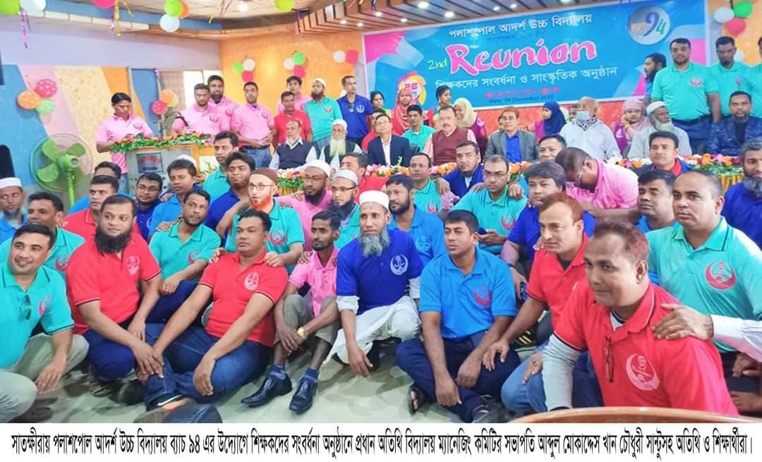 সাতক্ষীরায় ব্যাপক উৎসাহ উদ্দীপনা আর আনন্দঘণ পরিবেশের মধ্য দিয়ে পলাশপোল আদর্শ উচ্চ বিদ্যালয় ব্যাচ ৯৪ এর উদ্যোগে শিক্ষকদের সংবর্ধনা ও সাংস্কৃতিক অনুষ্ঠান অনুষ্ঠিত হয়েছে। শুক্রবার (১৮ ডিসেম্বর) শহরের কামালনগর তুফান কনভেনশন সেন্টার এন্ড রিসোর্টে পলাশপোল আদর্শ উচ্চ বিদ্যালয় ব্যাচ ৯৪ নির্বাহী কমিটির সভাপতি মো. মশিউর রহমান বাবু’র সভাপতিত্বে সংবর্ধনা অনুষ্ঠানে প্রধান অতিথি হিসেবে বক্তব্য রাখেন পলাশপোল আদর্শ উচ্চ বিদ্যালয় ম্যানেজিং কমিটির সভাপতি আব্দুল মোনায়েম খান চৌধুরী সান্টু।