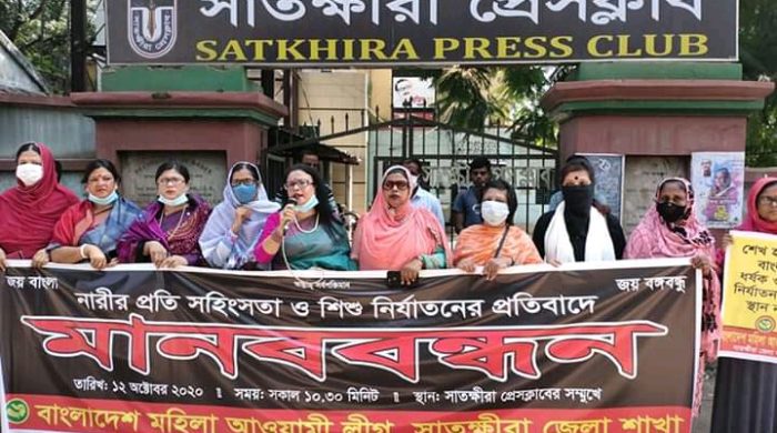 জেলা মহিলা আওয়ামীলীগের সহ-সভাপতি ফরিদা আক্তার বানুর সভাপতিত্বে মানববন্ধনে প্রধান অতিথির বক্তব্য রাখেন, সাতক্ষীরা জেলা মহিলা আওয়ামীলীগের সাধারণ সম্পাদক ও মহিলা কাউন্সিলর জোছনা আরা।